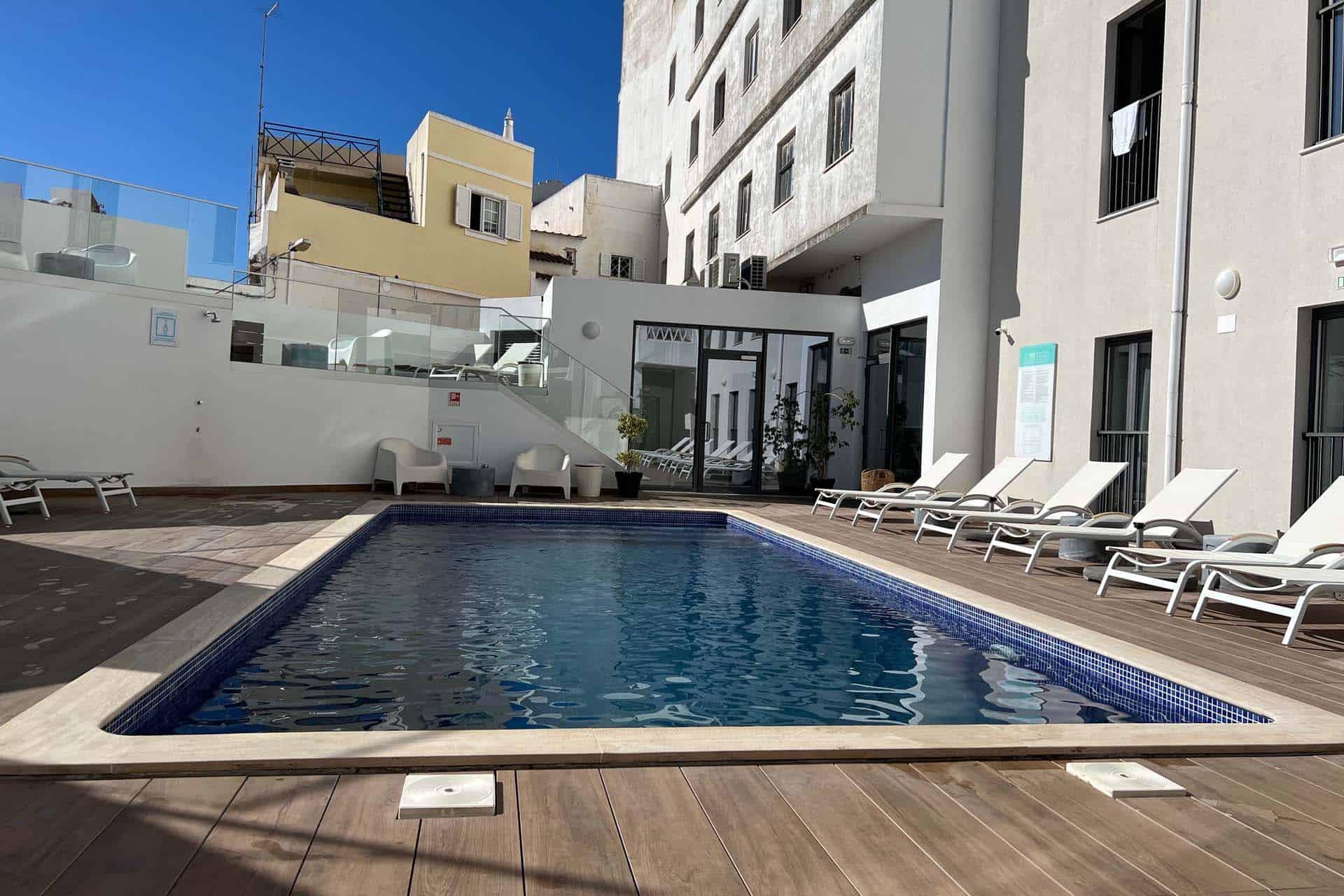 Tip waar te overnachten in Olhão: wij verbleven in hotel Cidade de Olhão, gelegen in het stadscentrum. Een kleinschalig hotel met gezellig ingerichte kamers en studios. En heel fijn als je met je gezin met kinderen in Olhão bent: het hotel heeft een buitenzwembad met een terras met ligstoelen.