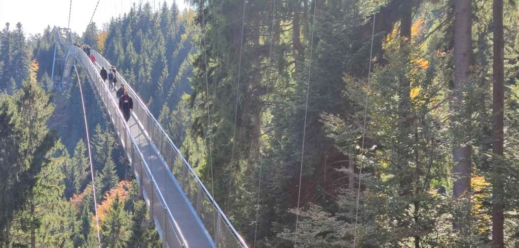 Over spektakel gesproken… Vond je het boomkroonpad nog niet spectaculair genoeg? Loop dan vooral door naar hangbrug Wildline: een brug van 380 meter lengte op 60 meter hoogte gespannen over een vallei in Bad Wildbad. Je loopt er in een kwartiertje naartoe vanuit de uitkijktoren. Ter plaatse staan automaten waar je een kaartje kunt kopen voor de hangbrug.