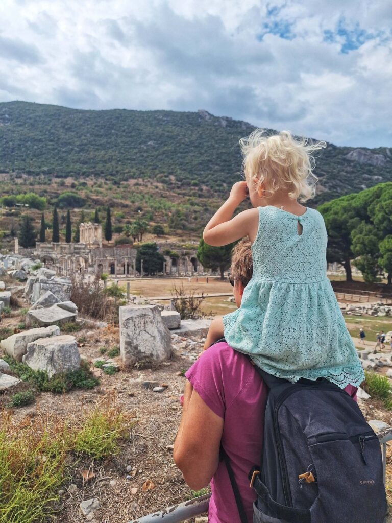 Efeze is een van de grootste archeologische vindplaatsen uit de Griekse oudheid, maar heeft ook een rijke Romeinse geschiedenis. Als je via de ingang boven op de heuvel binnenkomt, begin je bij het Odeion, een klein halfrond theater waar muziek- en theatervoorstellingen werden gehouden. Onze dochter vond het geweldig om op het podium te staan en te doen alsof ze zelf optrad. Vanaf de boveningang loop je langzaam naar beneden, zeker in de warmte fijner dan naar boven lopen. Bovendien heb je zo de grootste bezienswaardigheden aan het einde van je bezoek.