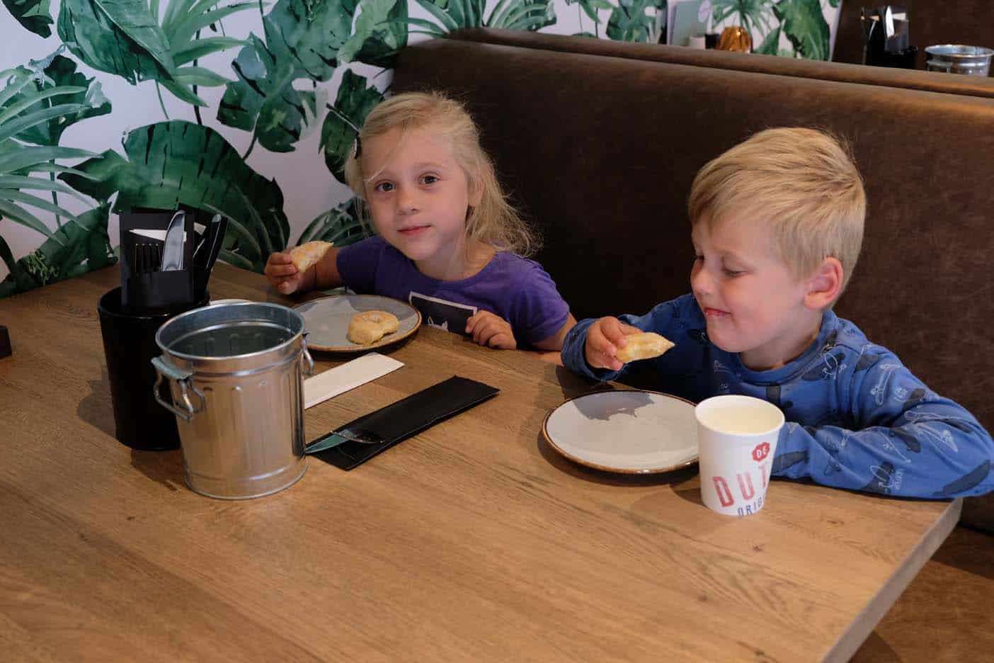 Voor kinderen is er een klein speelhoekje waar onze kleuters zich wel even vermaken. Hoewel het natuurlijk ook heel leuk is om op de bank te staan en te praten tegen de mensen in de andere zitjes. Op het kindermenu staan verschillende opties, maar wel allemaal gefrituurd terwijl ik het toch ook wel fijn zou vinden als er een gezondere optie zoals pasta tussen zou staan. Onze kleuters kiezen allebei voor de vis met frietjes.