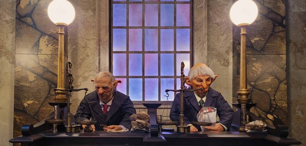 Binnenin de bank is één van de tofste attracties van Harry Potter World: Escape from Gringotts. Het avontuur begint al in de wachtrij voor de attractie, waar we in de marmeren hal met een enorme kroonluchter en veel pracht en praal kennismaken met de kobolden in de bank. Die zitten druk te schrijven achter de balie en zijn zo gemaakt dat ze je echt aankijken en je blik volgen, best een beetje griezelig.