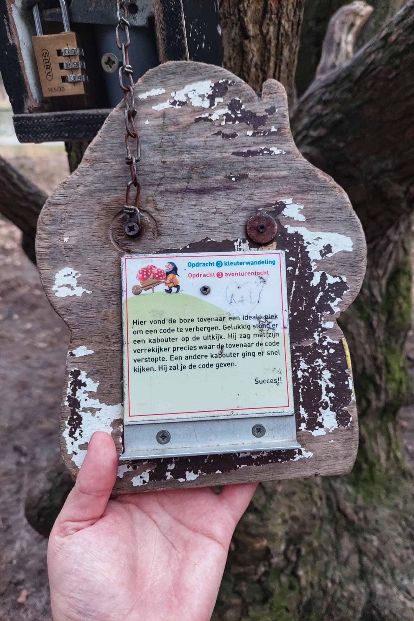De route loopt door het bos en geheel buggyvriendelijk is hij niet, bij de meeste gouden kaboutermutsjes kun je beter de buggy even laten staan terwijl je zoekt. Gelukkig hebben wij de buggy thuis gelaten en de draagzak mee, maar dit is dus dit is wel iets om rekening te houden. De opdrachten zijn heel leuk verstopt in kabouterhuisjes die in bomen te vinden zijn. Maar ook de opdrachten zelf zijn leuk en afwisselend en laat de speurneus in kinderen naar boven komen. Want wat spreekt er nou meer tot de verbeelding van voornamelijk kleuters dan echte kabouters? Bij verschillende opdrachten zie je kabouterbeelden die het hele verhaaltje afmaken.