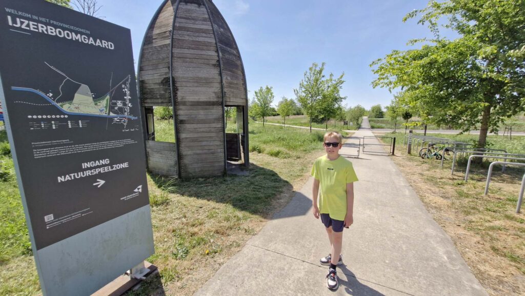 Na het ontbijt was het tijd om op ontdekking te gaan in het Provinciaal Domein IJzerboomgaard in Diksmuide. Daar werden we verrast met een van de leukste speelplekken van de Westhoek: de natuurspeelzone. Geen klassieke speeltuin met glijbanen en schommels, maar een avontuurlijk parcours vol water, hout, gras en zand.