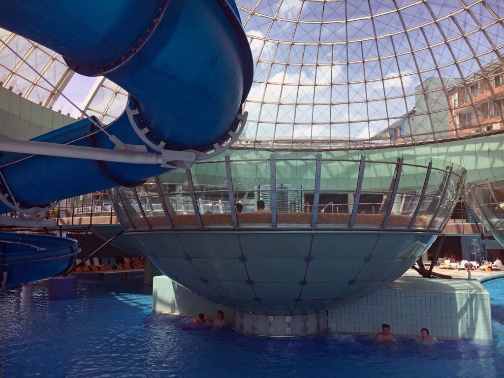 Bijzonder in dit bad is dat er behalve het grote zwembad ook een aantal verhoogde baden zijn in halve eivormen. Deze zijn extra lekker warm en hier fijn ontspannen. Door het glazen dak voelden wij ons echt helemaal zomers.