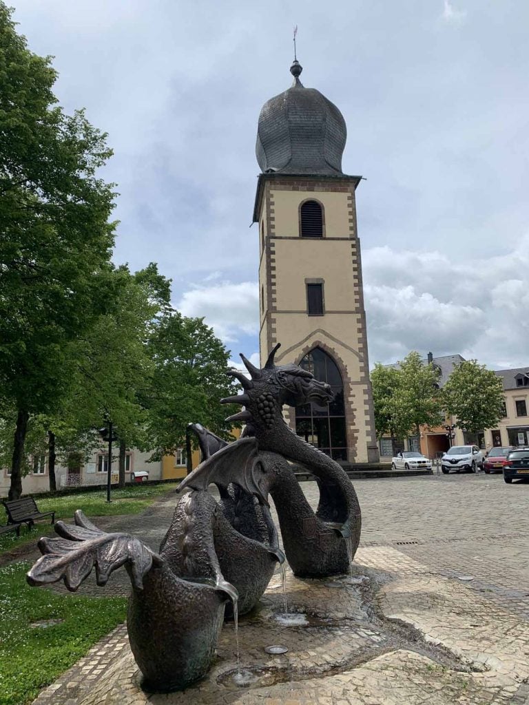 Onze volgende stop in de vallei van de zeven kastelen is in Septfontaines. Een pittoresk dorpje met gekleurde huizen en een kerkje. We parkeren de auto en lopen dan naar de boven het dorp gelegen Burg Simmern. Dit kasteel is privébezit en daarom niet te bezoeken. Het ziet er vervallen uit. De autoweg naar wat ooit de parkeergarage was, ligt nu vol met boomstammen. Mijn fantasie neemt een loopje. Van wie zou dit 12e-eeuws kasteel eigenlijk zijn en waarom doen ze er niks mee?