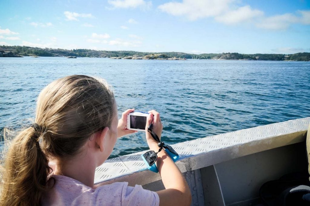 We varen de haven uit. Water, rotsen en in de verte de typische Zweedse rode huisjes kleuren het beeld. Het ziet er zo mooi uit! Onze oudste dochter houdt haar camera nu al voortdurend in haar handen: ‘Mam, kijk daar! Zie je die vogels lekker zitten op de rotsen?’ ‘Zijn daar al de zeehonden?’
