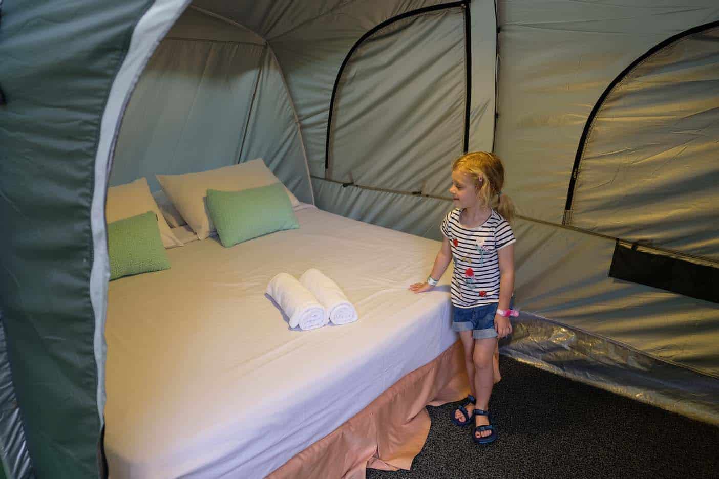 Ons onderkomen is van binnen erg ruim met zowel een tweepersoonsbed en twee eenpersoonsbedden. Er is zelfs een hangkast om kleding op te hangen! Waar ik verder heel blij mee ben is dat de tent een klein kastje voor toiletspullen heeft, meerdere stopcontacten herbergt en je hebt ook een supersnel wifi signaal. Daarbij krijg je handdoeken en douche producten. Te warm in de tent? Afkoelen doe je met de 2 ventilatoren of lekker buiten aan de campingtafel. Om de tent af te sluiten, krijgen we een slotje.
