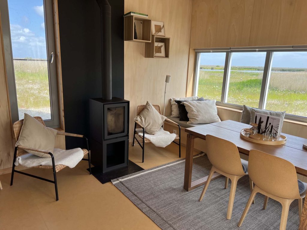 Ik kon het vierpersoonshuisje van binnen bekijken en ik was aangenaam verrast door het lichte interieur en de grote ramen. Zowel vanuit de woonkamer als vanuit beide slaapkamers heb je een ontzettend mooi uitzicht op het eiland. In de prettige woonkamer is een houtkachel aanwezig. Verder is er een compacte keuken waar je zelf kunt koken. Een heerlijk plekje om te zitten met een boek of met een spelletje. In de avond wanneer de dag gasten weg zijn, heb je het eiland vrijwel voor jezelf.