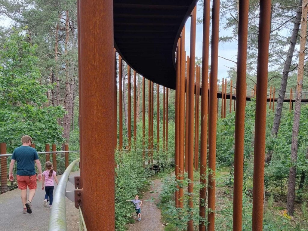 We wandelen naar Fietsen door de Bomen en nemen het pad omhoog, waarmee je geleidelijk op een hoogte van tien meter komt en we de boomtoppen om ons heen kunnen zien. Het pad is een soort spiraal met een dubbele cirkel, want als je verder blijft lopen, daal je even later weer af naar de grond. Een bijzondere beleving in de bossen. Let wel op met kinderen: hoewel voetgangers ook welkom zijn op dit fietspad, komen wij enkele fietsers en wielrenners tegen die weinig rekening houden met wandelaars op het fietspad.