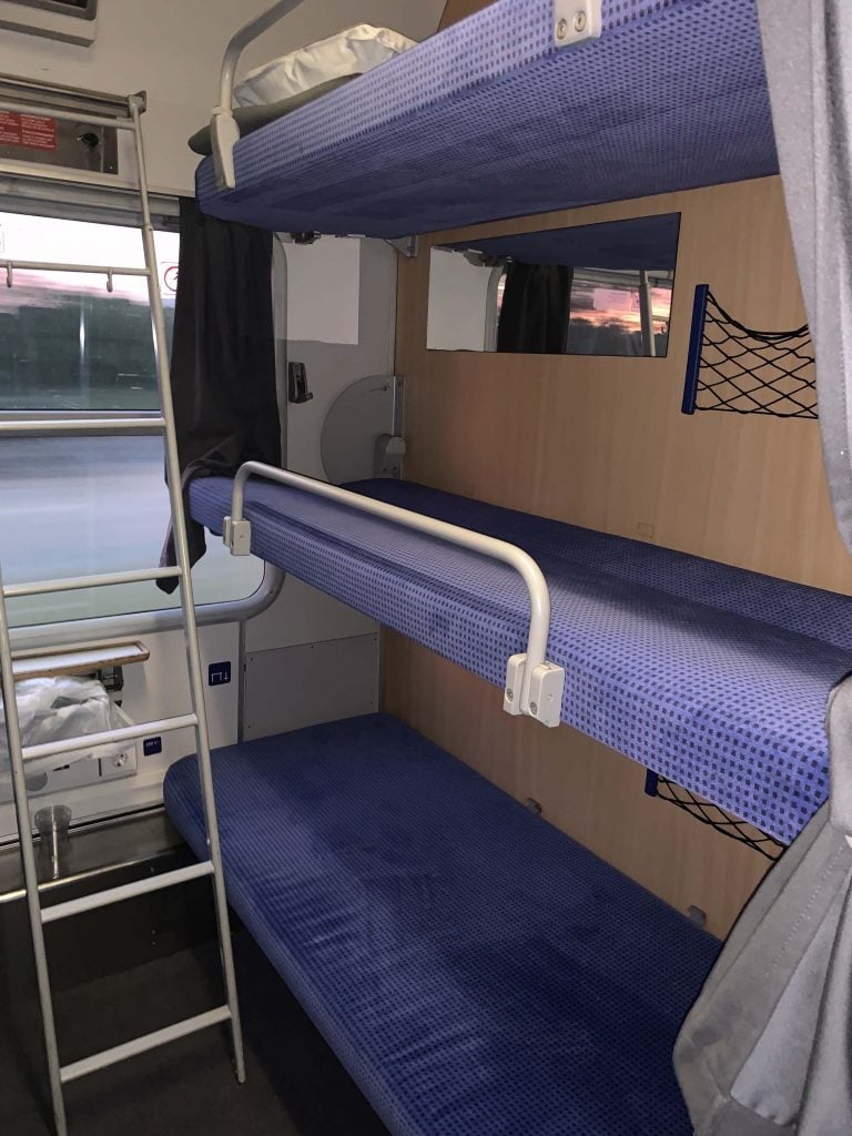 Benieuwd hoe een couchette van Nightjet eruitziet? Er zijn langs beide zijden van de coupé een drietal bedden boven elkaar. Het middelste bed is omlaag te klappen, waardoor dan een rugleuning ontstaat voor het bankje. Als we binnenkomen, is het tafelblad al opgeruimd. Deze ligt onder een van de onderste bedden. Een laddertje bij het raam maakt het mogelijk om op de hogere bedden te klimmen.
