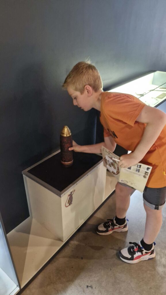 Een van de andere ‘hoogtepunten’ van het museum is de gereconstrueerde dugout – een ondergrondse schuilplaats waar soldaten leefden, sliepen en zich schuilhielden. Je daalt letterlijk af in het verleden, door smalle gangen en donkere kamers. Cas vond het spannend én indrukwekkend: “Het stinkt hier wel een beetje, maar dat zal toen ook wel zo geweest zijn denk ik”.