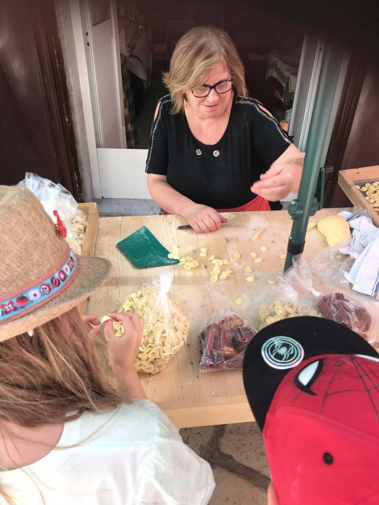 De afgelopen dagen hebben wij veel pasta gegeten in Italië, maar we hadden nog nooit gezien hoe het gemaakt werd. Samen met de kinderen wilden we dolgraag dit van dichtbij bekijken en dus liepen we als eerste naar ‘De straat van de oortjes.’ In deze straat maken ze de welbekende Orecchiette, dat betekent letterlijk ‘kleine oortjes’ en zo zien deze pasta’s er ook uit. Het is een groot feest om door deze straten heen te lopen. Voor de kinderen is het super interessant om te zien hoe de pasta’s, die ze bijna dagelijks aten, gemaakt werd. In de smalle straatjes staan overal tafels voor de huizen waar oude vrouwtjes de bekende pasta uit de regio maken. De vrouwtjes zijn erg lief en vertellen de kinderen precies hoe het werkt, ook mogen ze proeven en natuurlijk nemen wij verse pasta mee voor thuis!