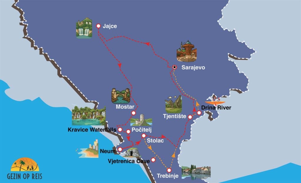 De beste reistijd voor Bosnië en Herzegovina is van mei tot en met de oktober. In het voorjaar is alles frisgroen en staan de rivieren vol water, wat het extra mooi maakt voor wandelingen en watervallen. In de zomer kan het in de steden warm worden, maar dit is juist een ideale tijd om te zwemmen in de vele meren en watervallen in het land. Ook zijn in de zomervakantie alle attracties open. Je kunt de route die wij hebben gereden uitbreiden met raften op de Drina rivier en een aantal andere extra activiteiten.