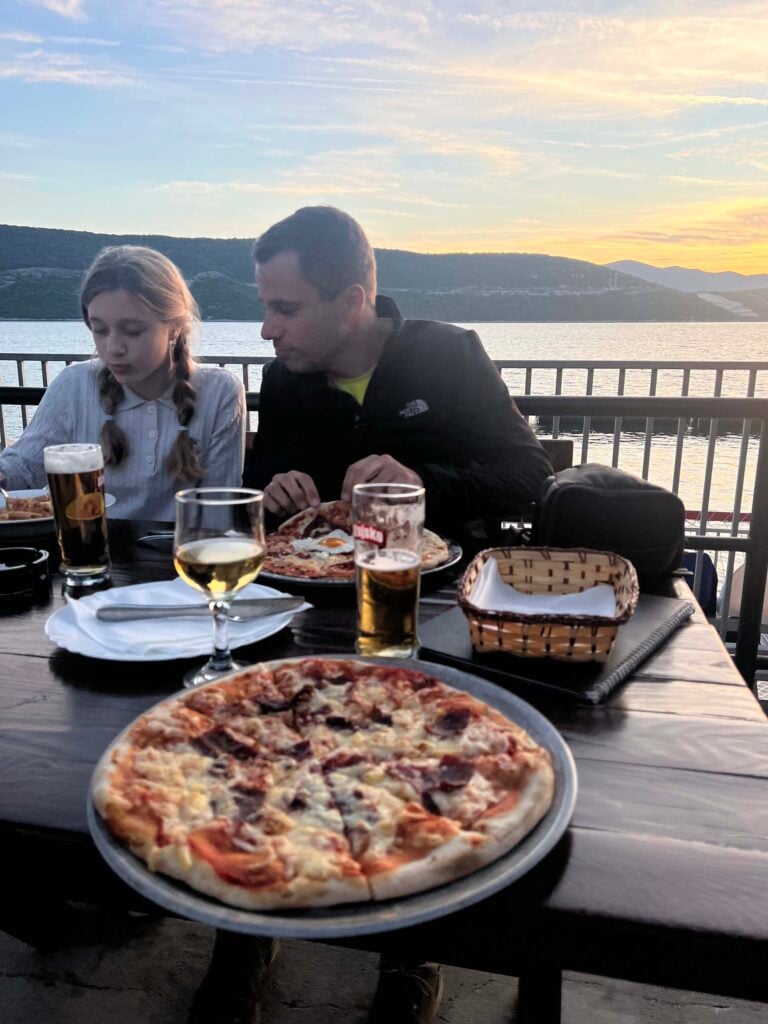 Aan het eind van de dag komen we aan in Neum, de enige kustplaats van het land. We vinden een restaurant en eten heerlijke pizza met uitzicht op het water. De ondergaande zon met de licht zoute zeelucht maakt het vakantiegevoel compleet. Verder is het een vrij lelijke en in het naseizoen uitgestorven badplaats. Voor ons vooral een praktische tussenstop, na een lange dag onderweg is het fijn om even aan zee te zijn.