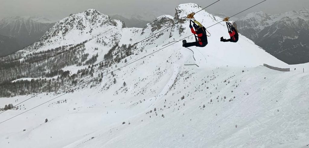 Als je zin hebt in een adrenaline kick, dan moet je zeker met de zipline gaan. Of zoals ze het in het Frans noemen: de tyrolienne géante. Deze vertrekt direct naast het topstation van Serre Chevalier en is dus ook bereikbaar (via twee gondels) voor niet wintersporters.