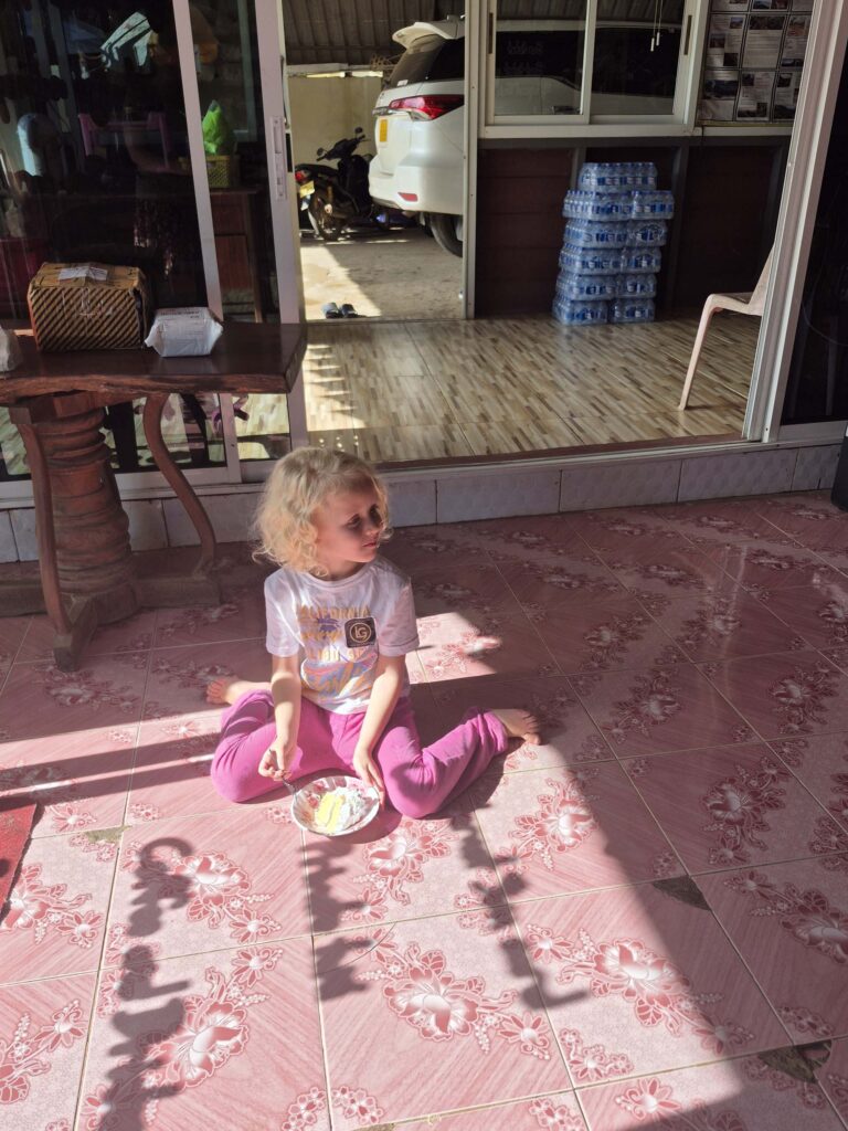 Op de boot kun je wat drinken en snacks kopen, maar het aanbod is beperkt en niet altijd even kindvriendelijk, op wat chips na. We zijn blij dat we vooraf in Chiang Rai bij de 7/11 al goed hebben ingeslagen: drinken, fruit, droge snacks, broodjes en wat lekkers voor tussendoor.