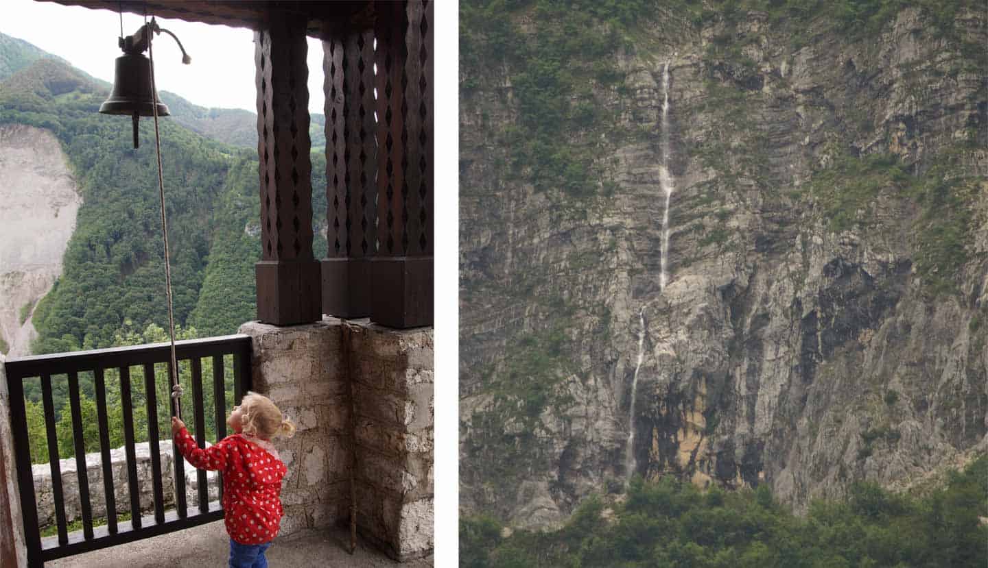 De beheerder van de kerk geeft ons nog een goede tip voor een plek waar we de bij de Tolminka rivier kunnen komen. Misschien dat deze stroom hier zo direct tussen de bergen nog iets meer kleur heeft. We reden dezelfde weg weer terug en stopten bij de tweede waterval waar we langs komen. Het is hier net iets breder waardoor er 2 auto’s kunnen parkeren.