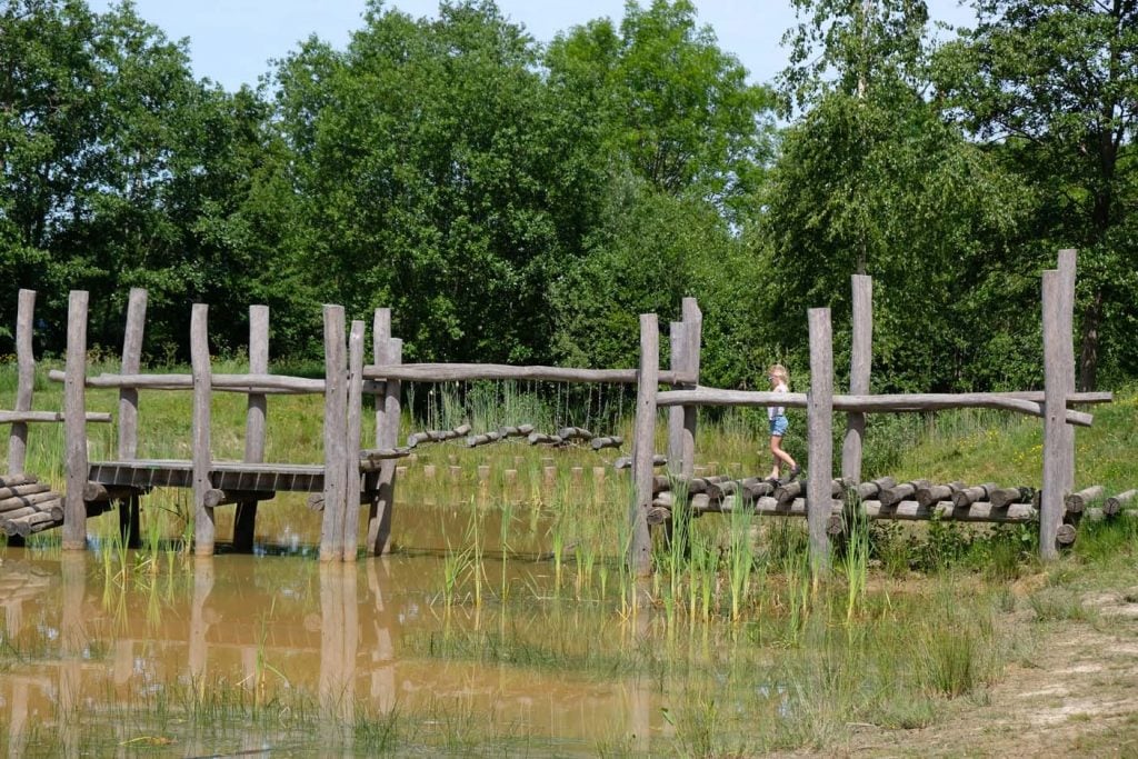 Touwbruggen, waterpomp, boomstammen en vlonders in t water, boven het water hangen in een net. Midden in het bos. Geen horeca in de buurt. Wel picknick tafels.