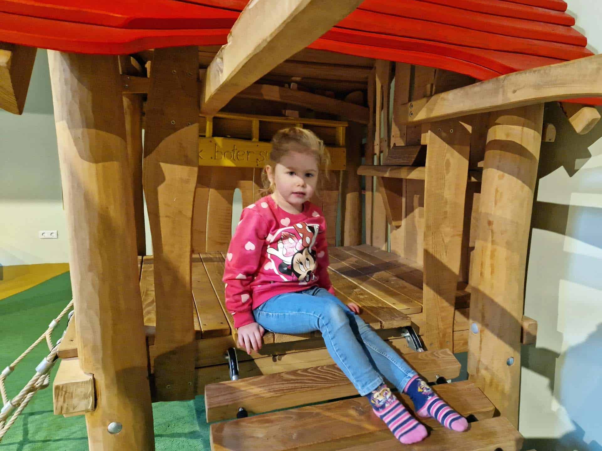 Kinderen onder de 3 jaar mogen alleen onder begeleiding spelen, dit is ook nodig omdat het baby- en peutergedeelte niet is afgezet. De speeltuin bestaat uit een boven- en benedenverdieping die met een trap zijn verbonden. Omdat dit verder open is en onze kinderen nog te klein zijn om zelf te spelen, gingen wij gezellig mee. Het baby- en peutergedeelte bestaat uit 2 kleine trampolines, houten gekleurde speelhuisjes met verschillende glijbanen en evenwichtsbalken. Onze dochter ging helemaal op in het houten winkeltje en keukentje. Ze bakte pannenkoeken voor iedereen! Via een tunnelglijbaan ga je naar beneden. Hier zijn wat meer klim- en klauteractiviteiten, hangbruggen, grote glijbanen en bovenin nog een groot net om te klimmen.