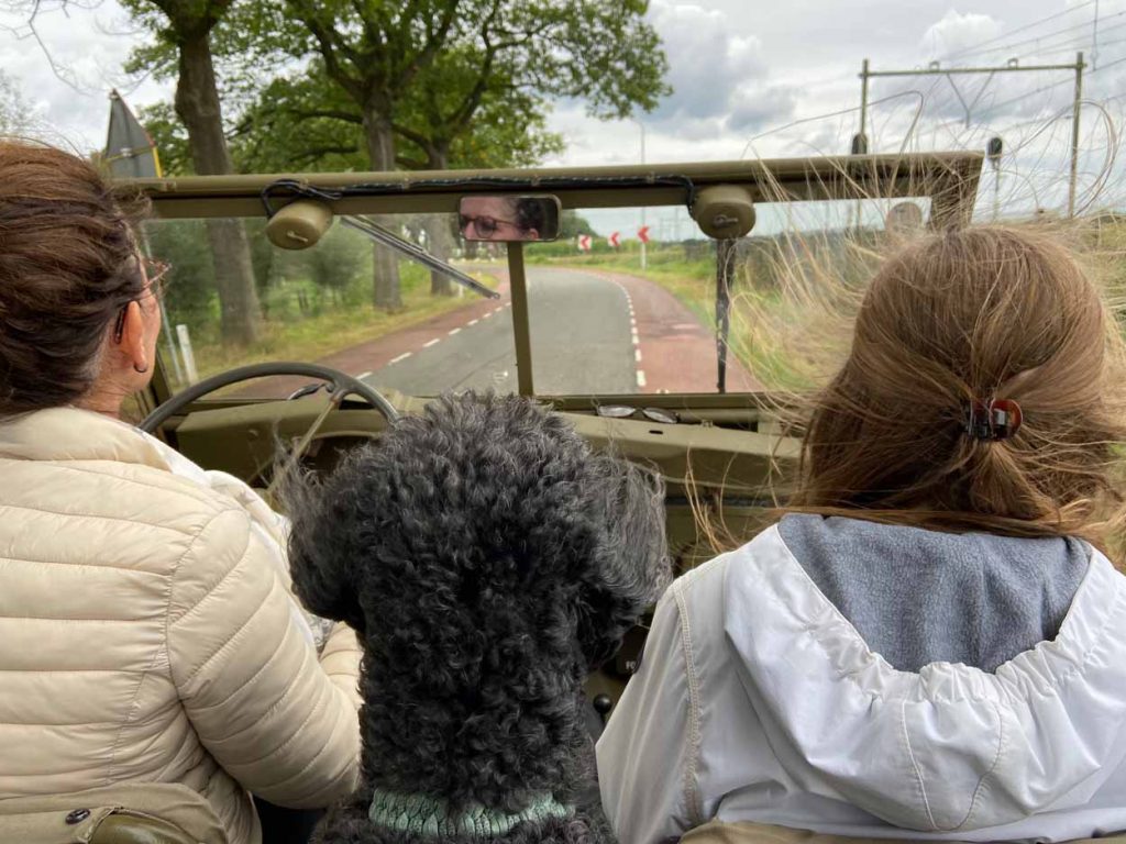 Voor ons weekend was de fietsroute, met wat aanpassingen, omgezet in een autoroute. We starten onze autotour tocht “Aan de andere kant” op het parkeerterrein van vakantiepark Landal De Vers, waar we het weekend verblijven. Er is voor ons heel speciaal vervoer geregeld. Rein, Elleke en hond Moby halen ons op in twee legervoertuigen waarmee we de route gaan rijden.