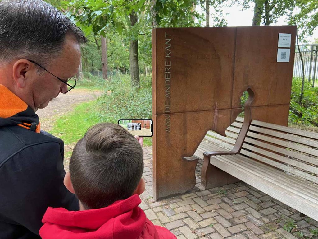 Een van de routes die je kunt volgen met de Venray Remembers App is de bijzondere fietsroute “Aan de andere kant”. Deze route van 59 kilometer brengt je langs verschillende bezienswaardigheden, maar ook langs zes “beleefpunten”. Bij de duidelijk herkenbare “Aan de andere kant bankjes” kun je met de app de bijbehorende verhalen lezen of de video bekijken. De speciale “augmented reality videos” kun je met je smartphone in de omgeving projecteren. En hoe gaaf, je fietst ook nog over de nieuwe fietsbrug dwars door het Oorlogsmuseum Overloon. De fietsroute heeft geen vast begin- of eindpunt, dus je kunt overal in de route starten.
