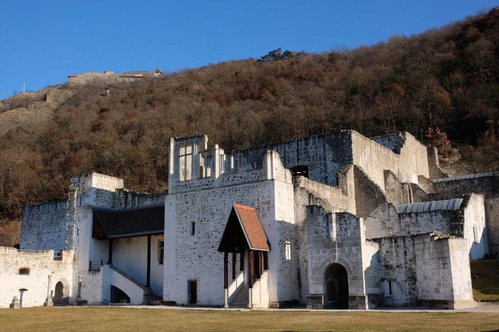 De route die we omlaag volgen, is flink steil, daarom zou ik aanraden de route niet andersom te lopen. Na een tijdje komen we bij een indrukwekkende poort. Binnen de muren ligt de Salamon-toren, het lager gelegen kasteel op een kleine heuvel bij de rivier. Jammer genoeg is er hier veel gebruik gemaakt van beton bij de restauratie. Van 1 mei tot 30 september is het van woensdag tot en met zondag mogelijk om tegen betaling de toren te beklimmen.