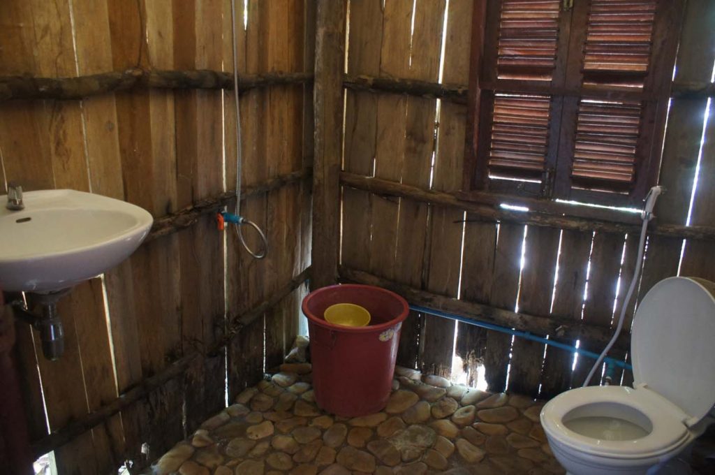 Onze bungalow op dit eiland kostte nog geen 2 dollar per dag, dus daarvoor kan je natuurlijk geen badkamer verwachten. In plaats daarvan was er een gedeelde Aziatische squad wc. Die werd trouwens spotloos schoon gehouden. Het was alleen die tijd van de maand dat je toch liever een zit wc hebt.
