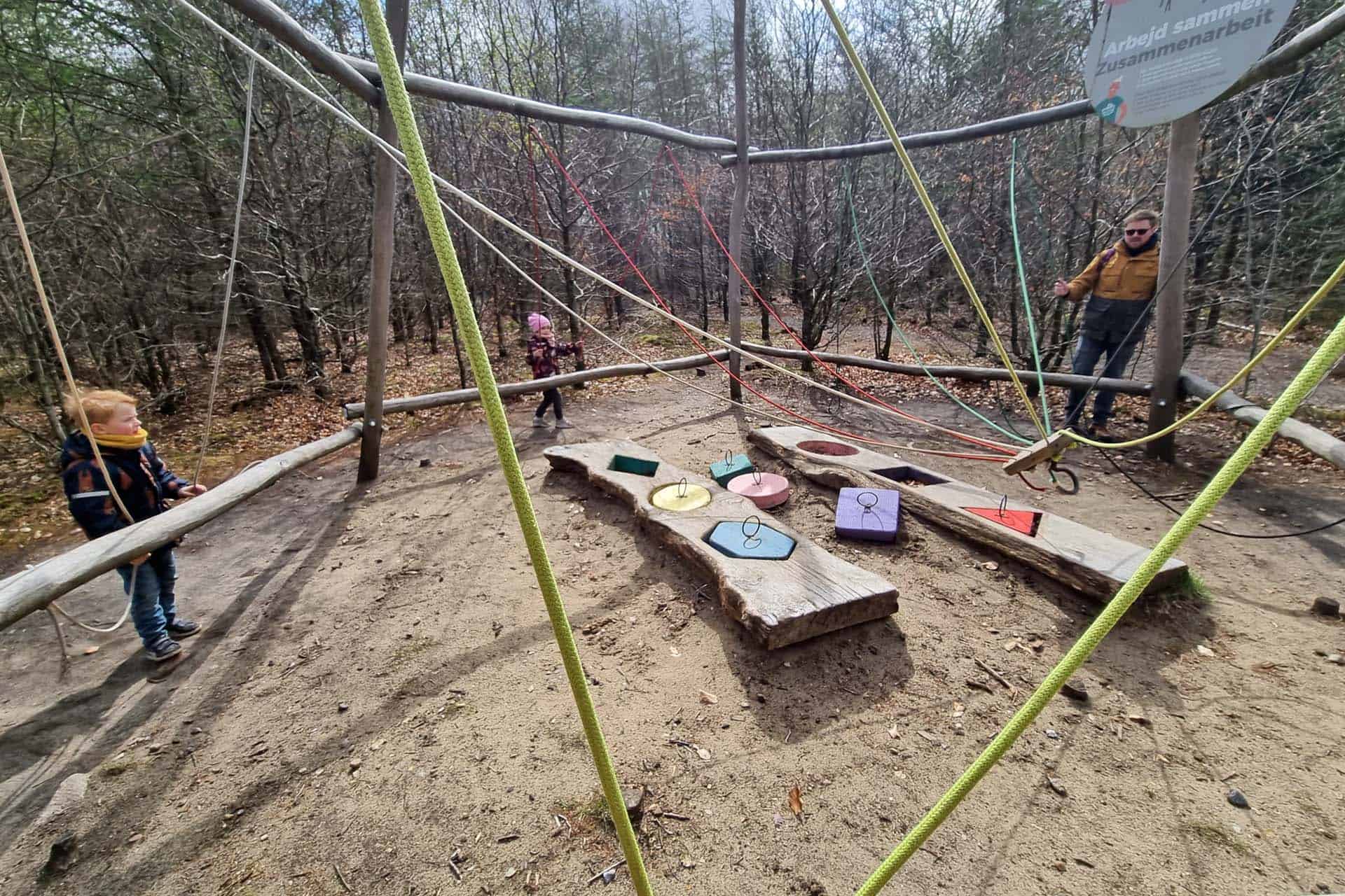 Samen met onze kinderen gaan we daarna verder met de verschillende kabelbanen, proberen we het lopen op een koord uit, gaan basketballen en proberen we het ringwerpen uit met grote ringen van touw. Mijn man is vervolgens de enige die het aandurft om de klimmuur op een draaiende schijf te beklimmen: hij klimt er op en wanneer hij bijna boven is, begint de schijf op zijn kop te draaien en deze positie houdt hij niet lang vol… Onderweg komen we ook een spel tegen waarbij iedereen als team moet samenwerken om de puzzelstukken naar de goede plek te krijgen.